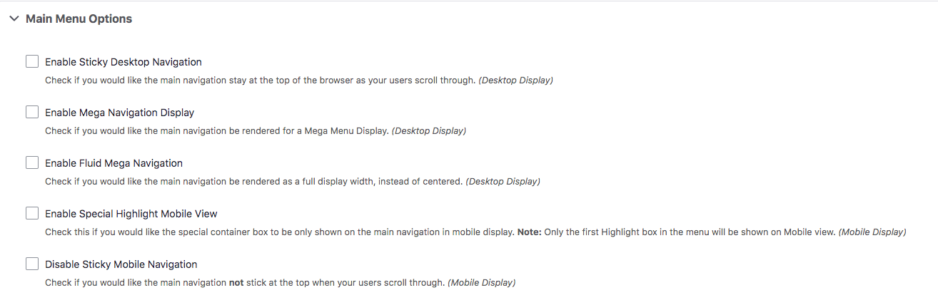 main menu options